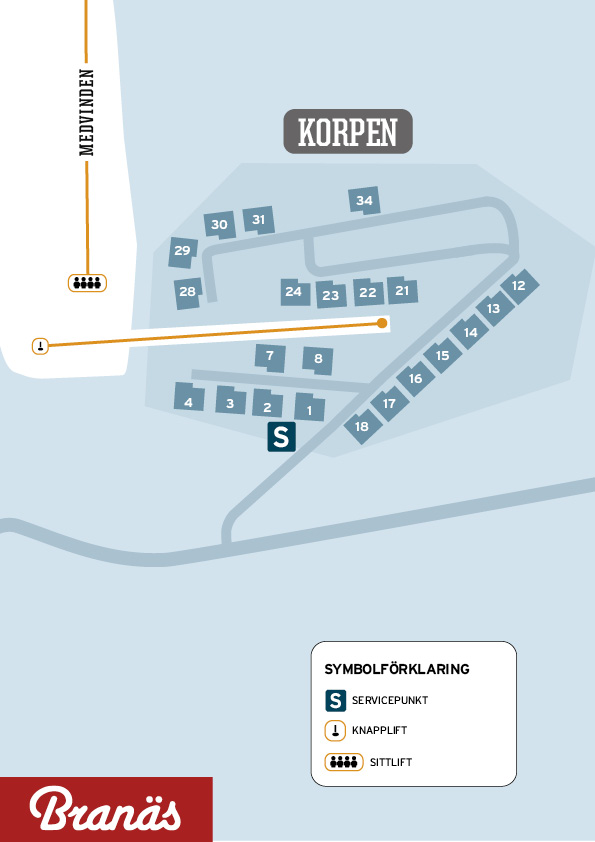 Here you will find overview maps of our three areas, Branäsdalen, Mattesdalen and Berget. To help you find your favorite accommodation quickly and easily, we have also included maps with cottage numbers in all our accommodation areas.